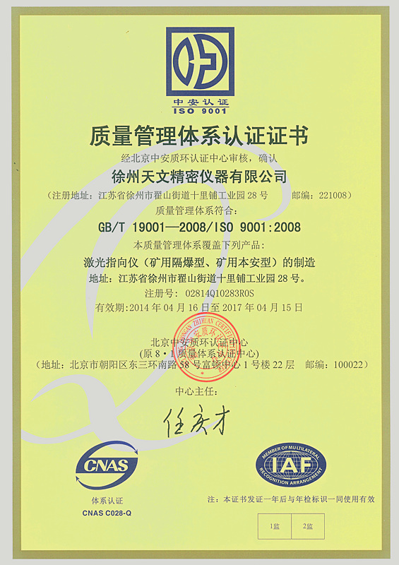 徐州天文精密仪器有限公司创建于1998年,坐落在江苏省徐州市矿大南十里铺工业园28号。现代化的企业管理队伍、高水平的研发团队、先进的生产设备、严格的质量管理体系和完善的产品检验流程,确保了产品质量和技术指标及性能达到当今世界先进水平,已通过ISO9001:2000质量体系认证。是一家以生产激光光学精密仪器为主导,集设计、研发、制造、销售于一体的高新技术企业。 |
